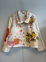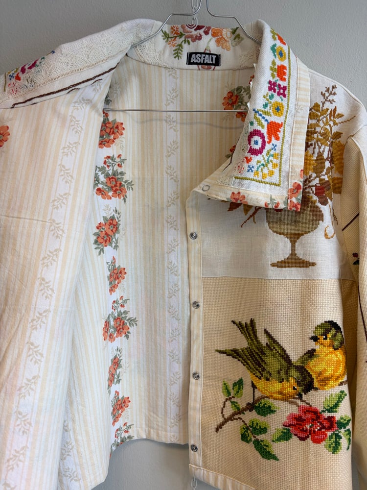 On this jacket there is a collection of beautiful flowers and birds.