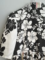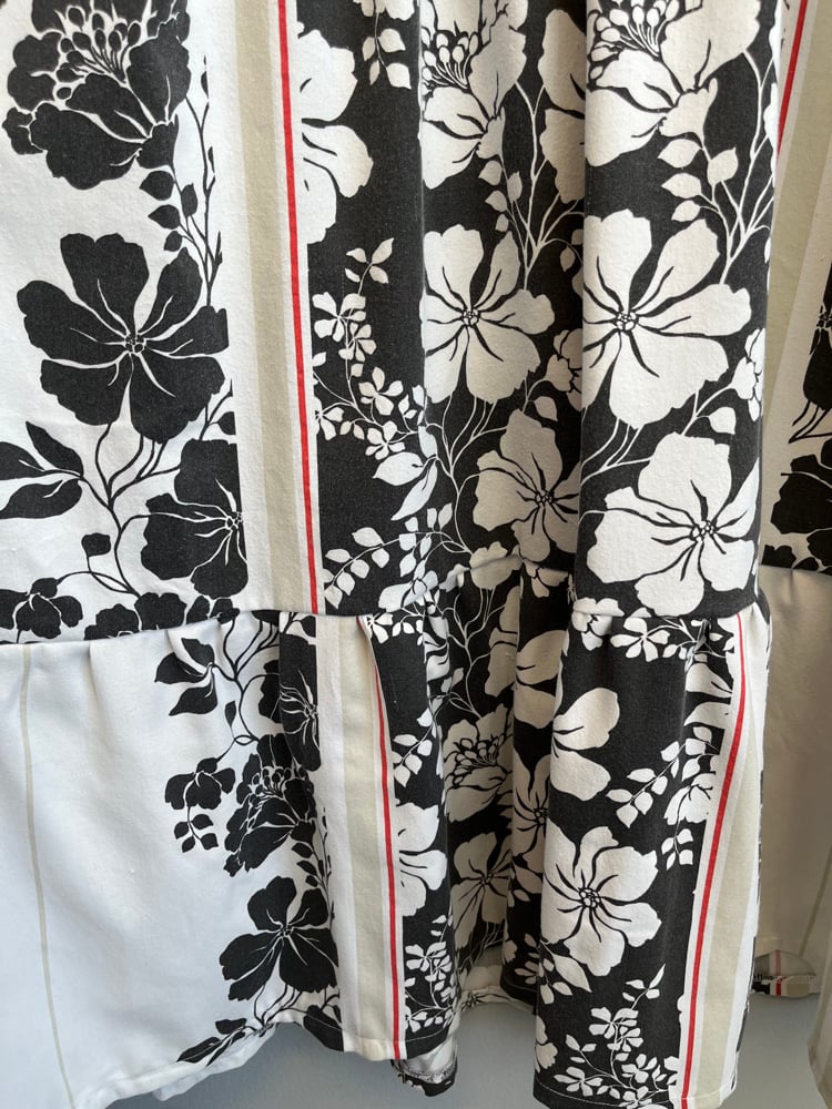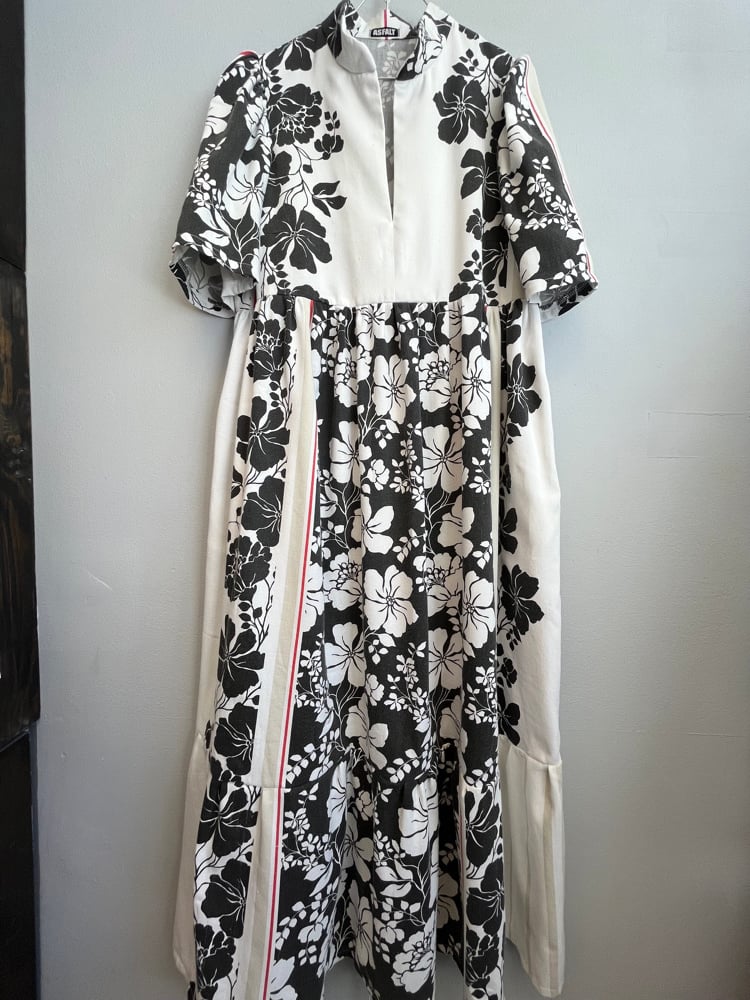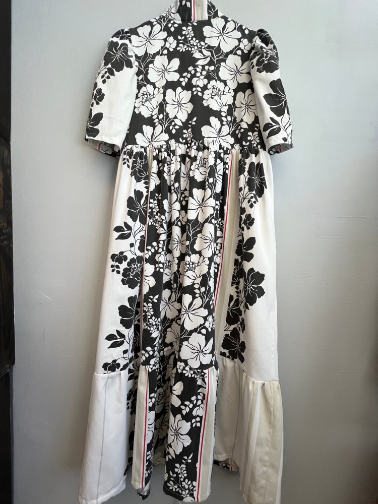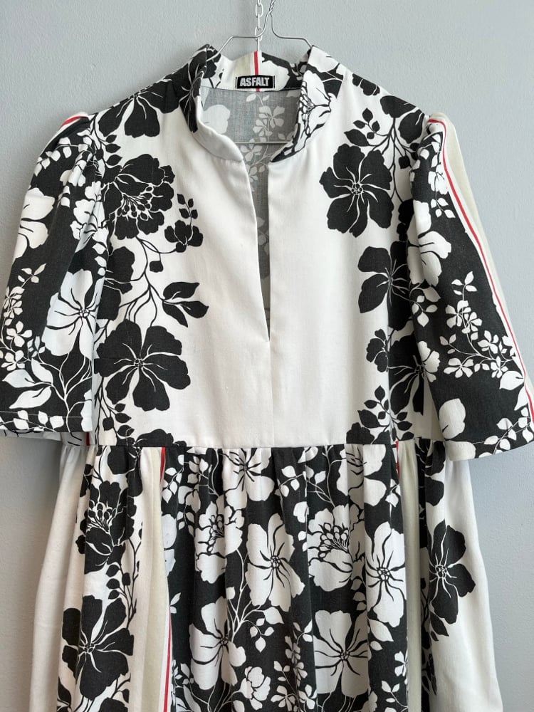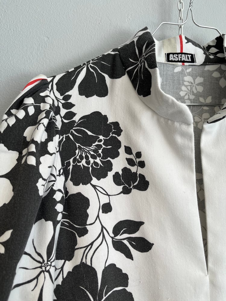 Ella kjolen har en meget klædelig pasform, med høj talje, lille krave og store pufærmer. Lommer i siden.