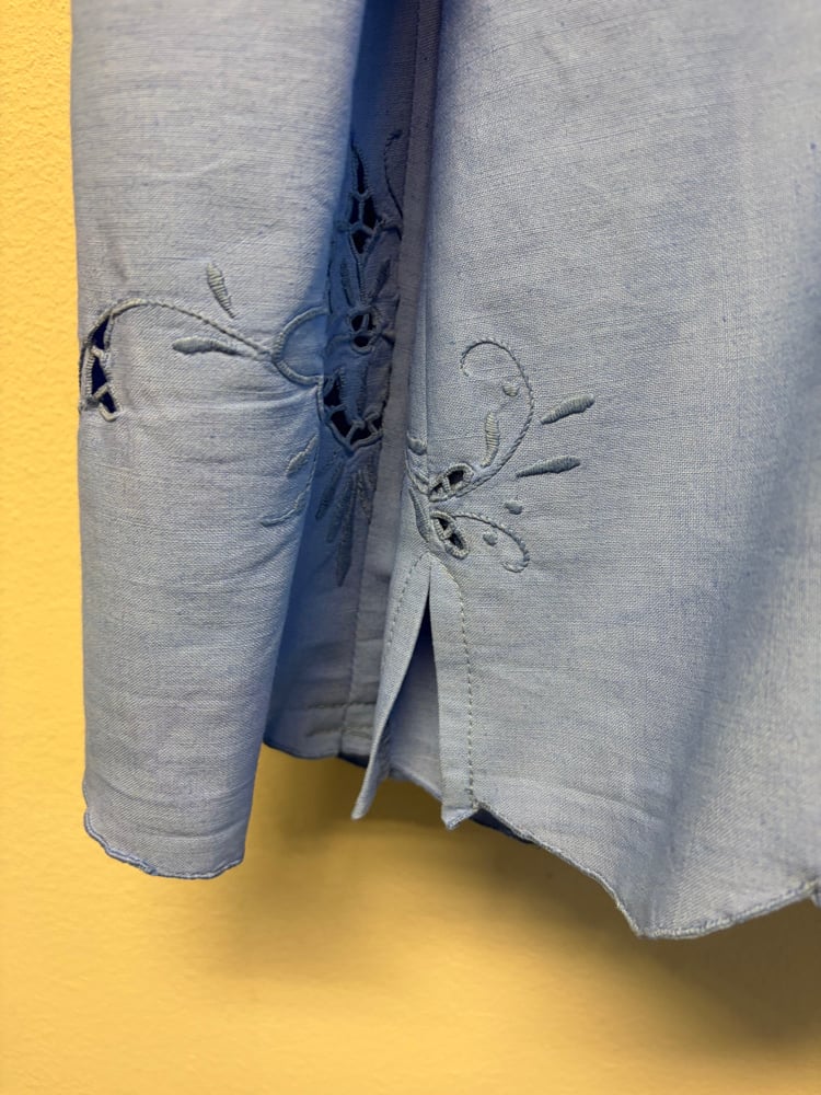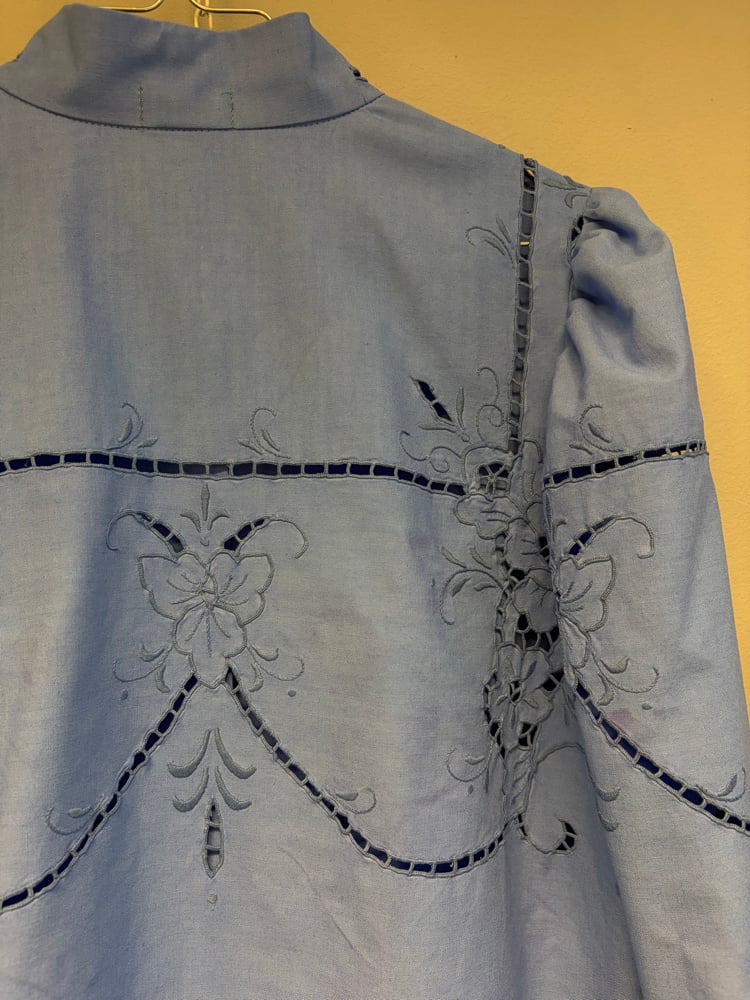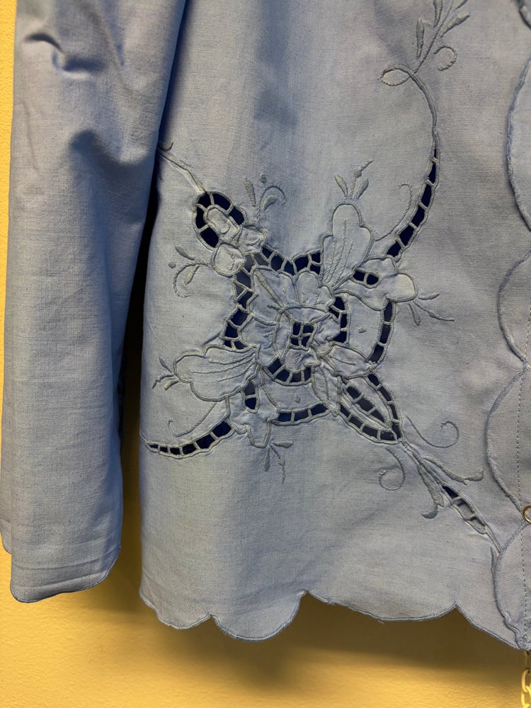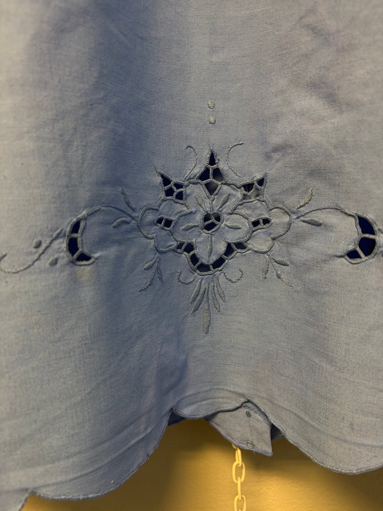 Shirt made out of embroidered table cloth, dyed blue.