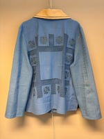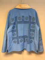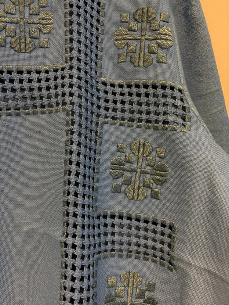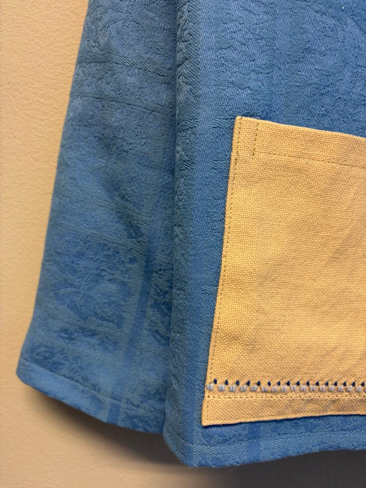 Shirt made out of table cloths dyed blue.