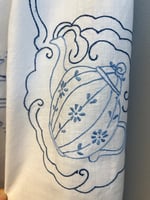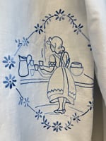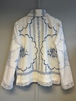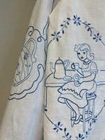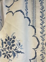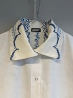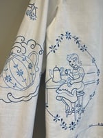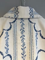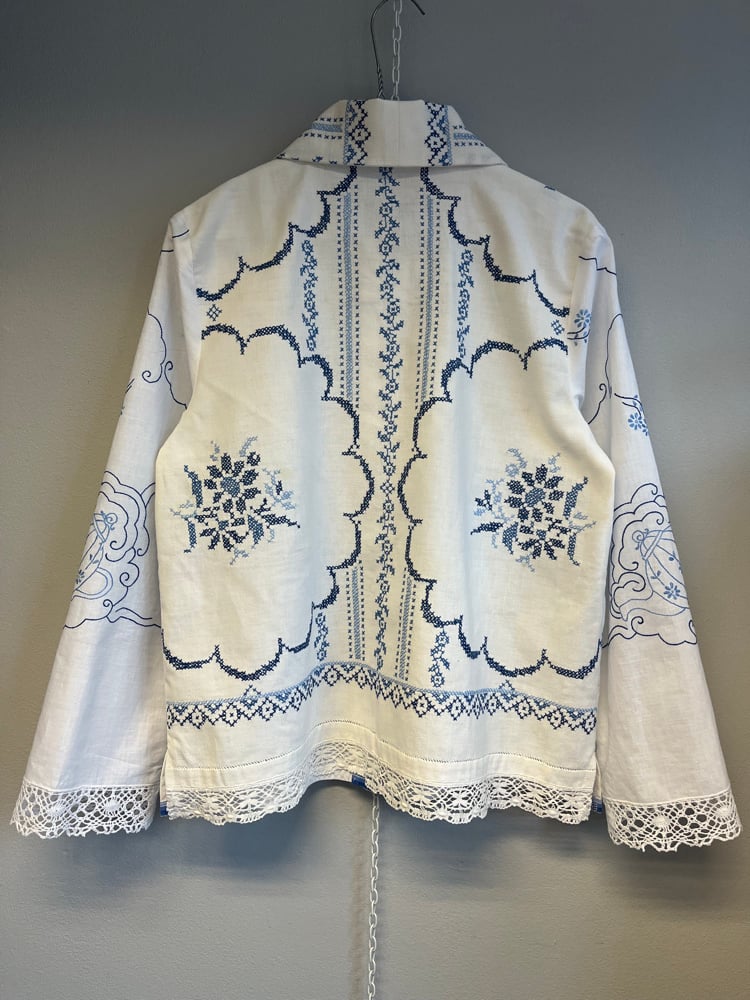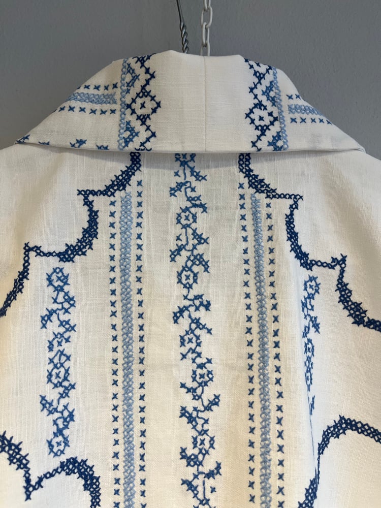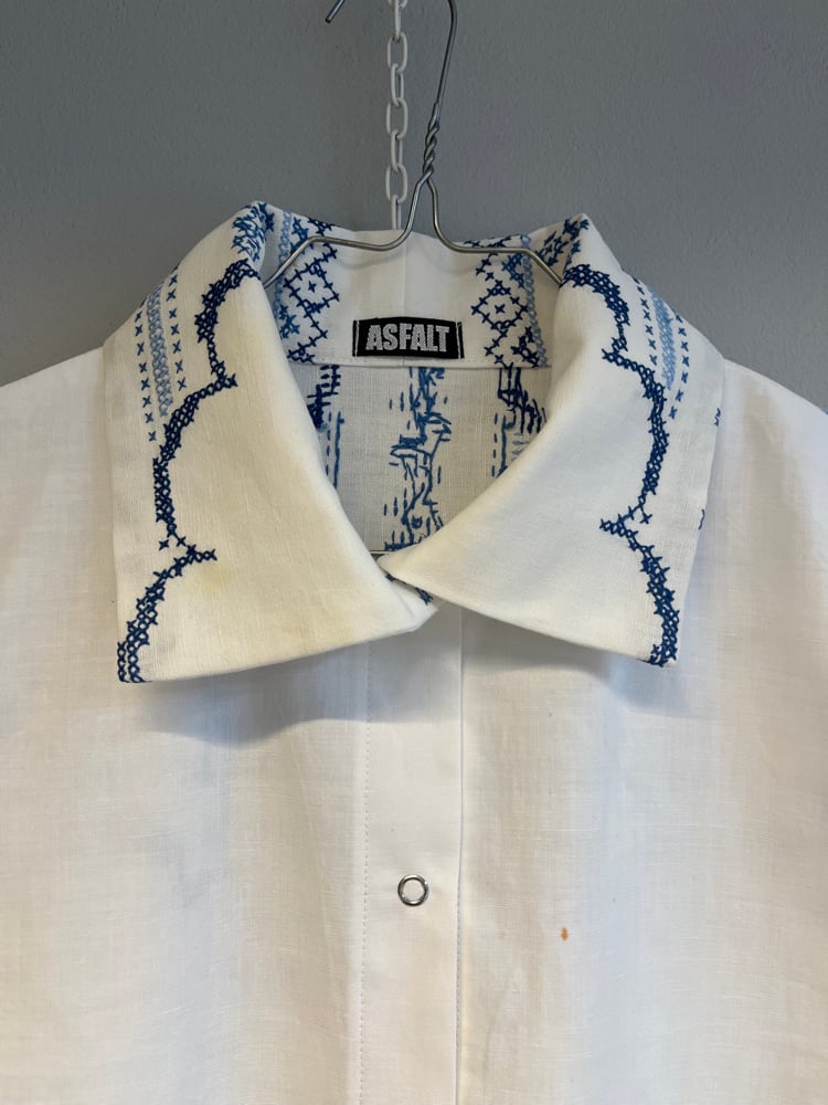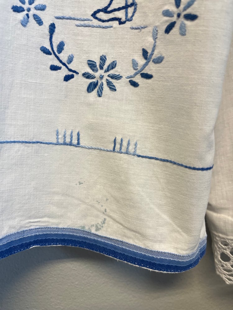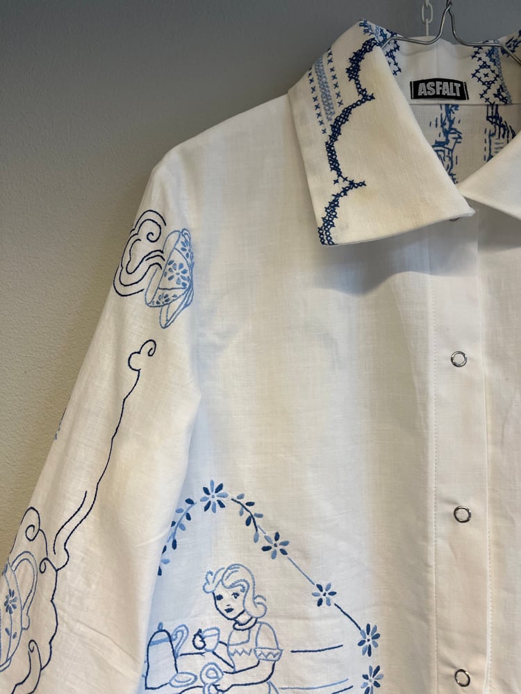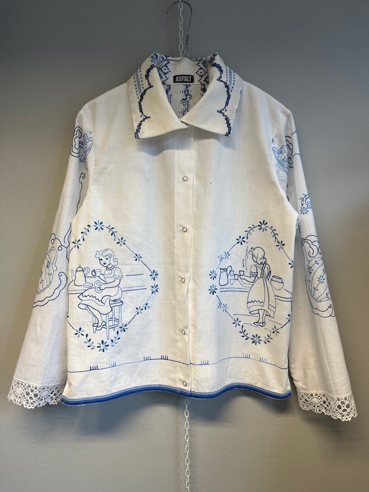 Shirt made out of 3 different smaller table cloths with blue embroideries.