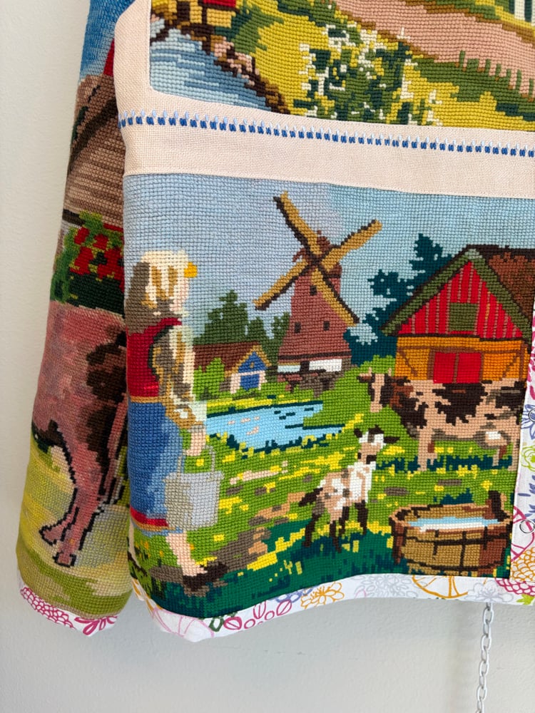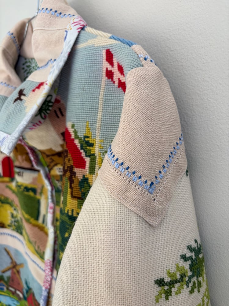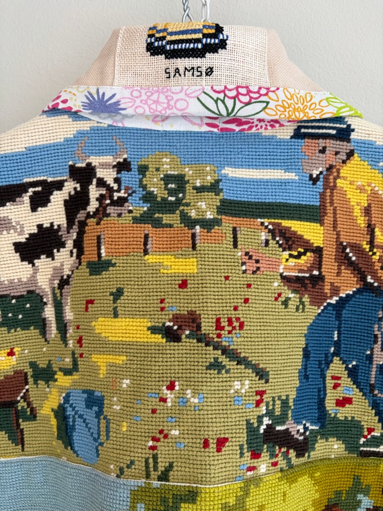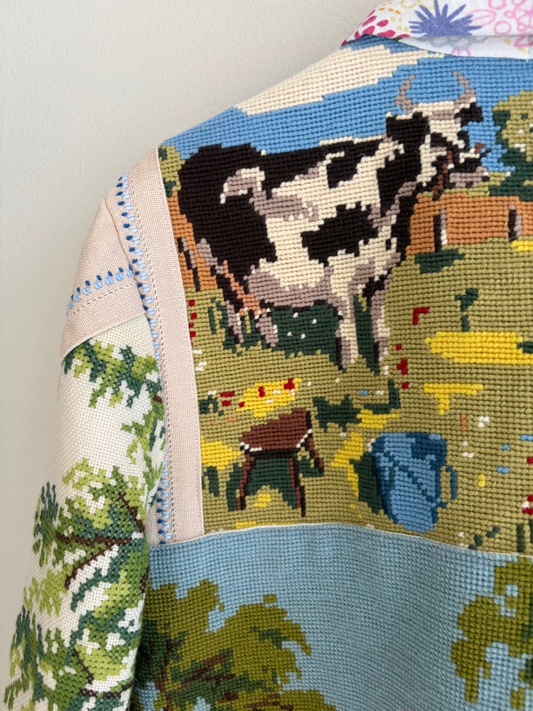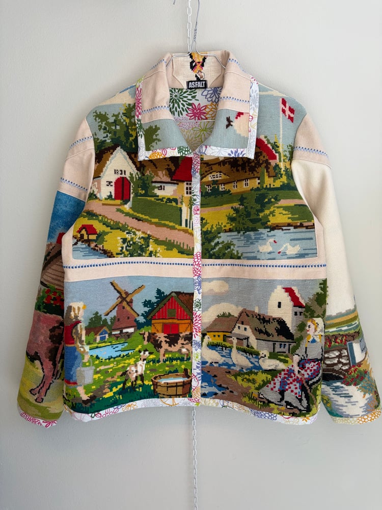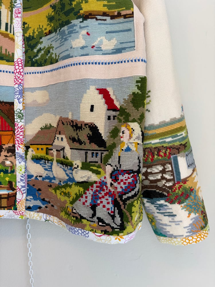 On this jacket there is a gathering of beautiful needle points with countryside idyllic.