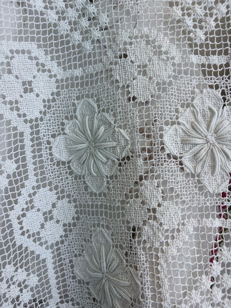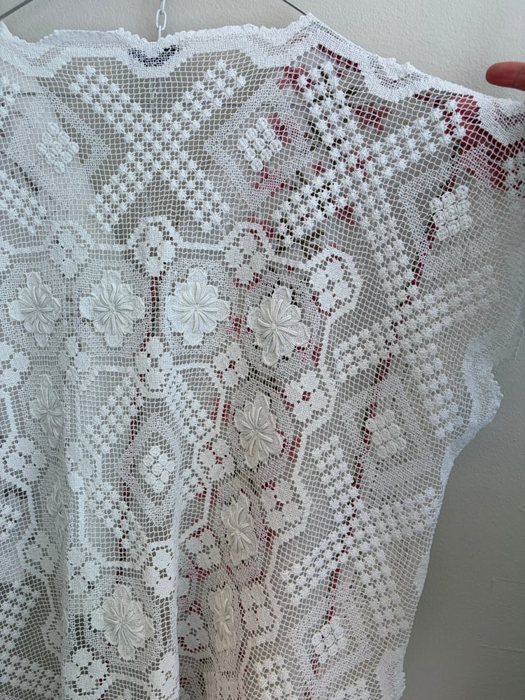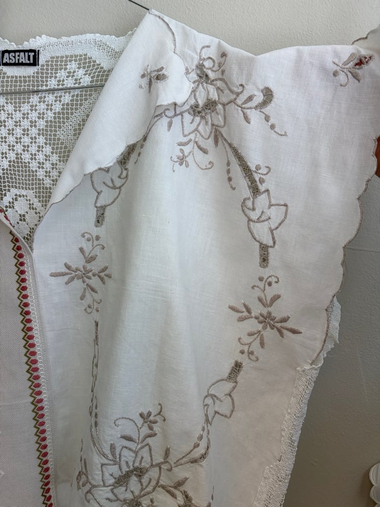 Denne er syet af fine hvide hæklede og kniplede stykker håndværk.