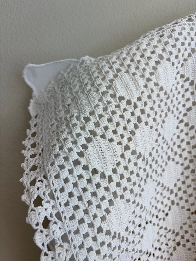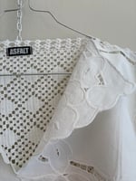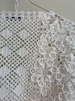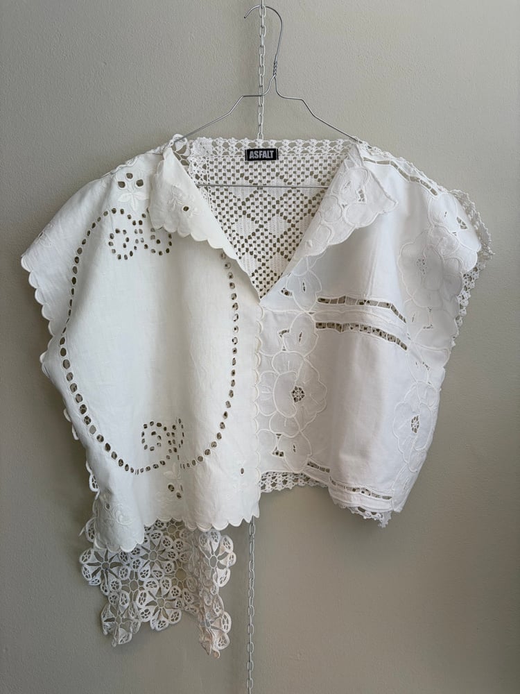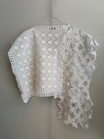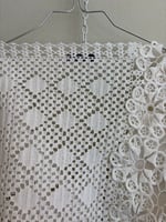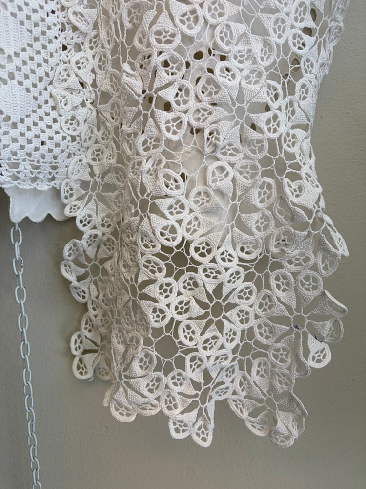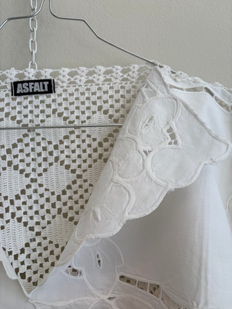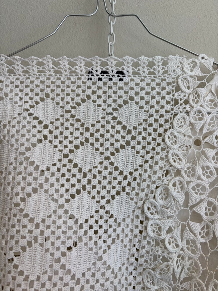 Denne er syet af fine hvide hæklede og kniplede stykker håndværk.
