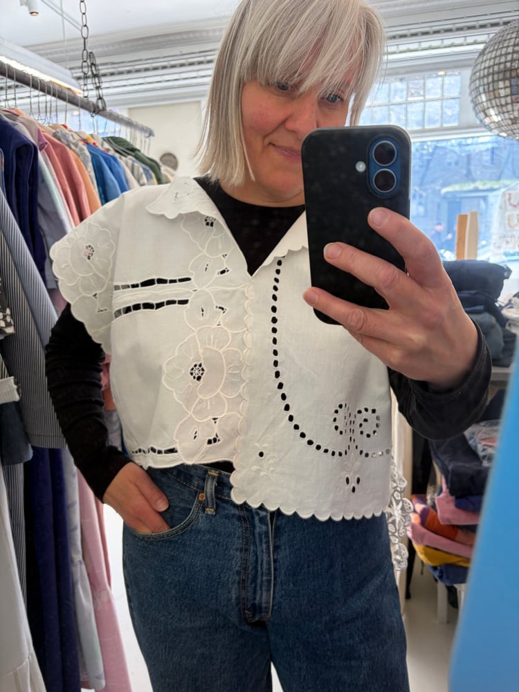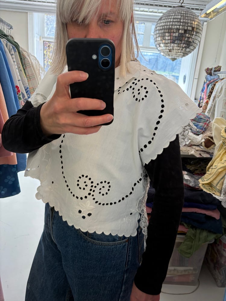 Daisy toppen er syet af smukke genbrugsstoffer uden at klippe noget væk. Bruge de fine hæklerier, broderier og vævede stofstykker som de er.