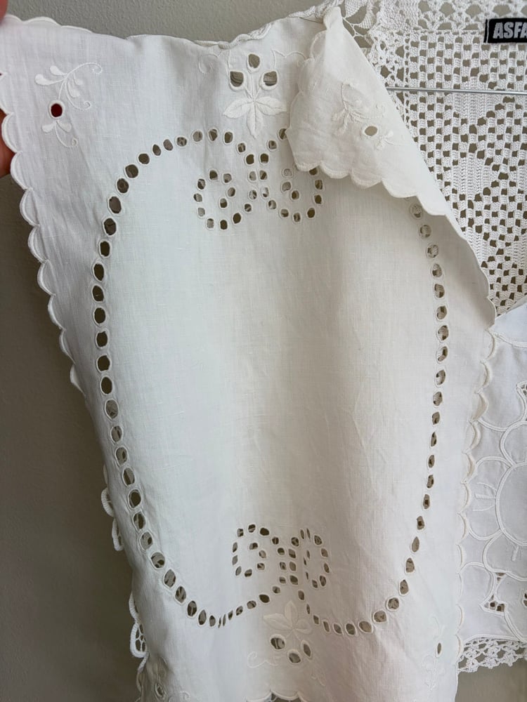 This one is made with beautiful white crocheted and embroidered pieces.