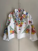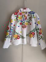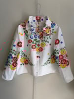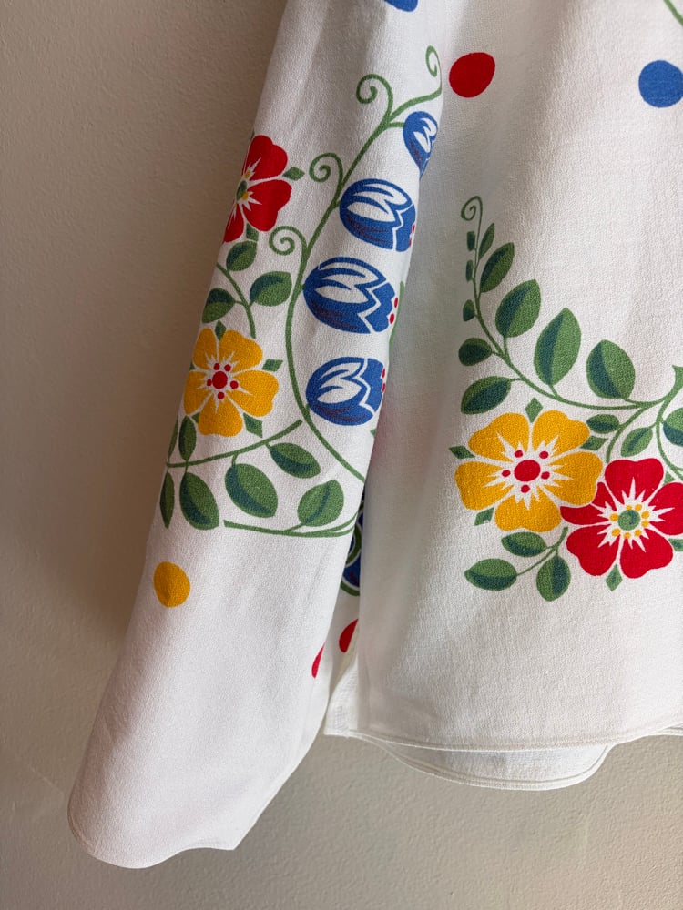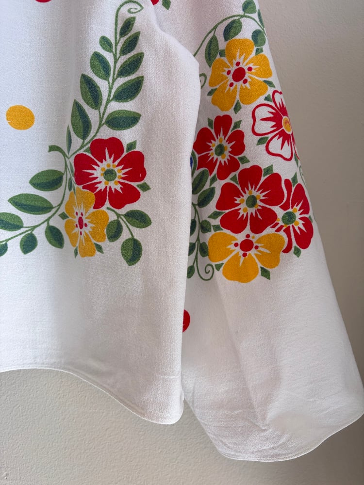 Shirt made out of a beautiful flower printed tablecloth.