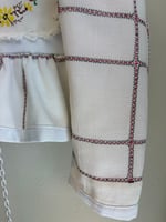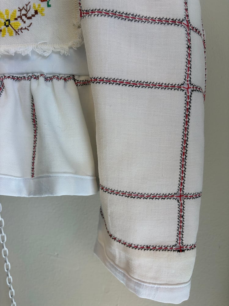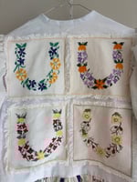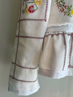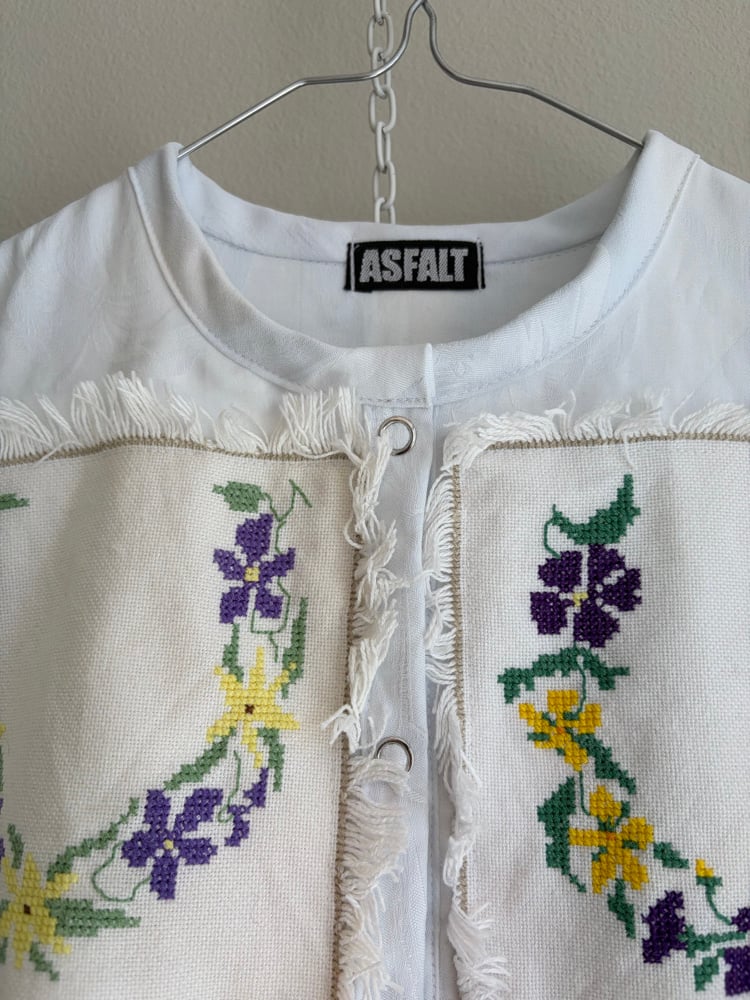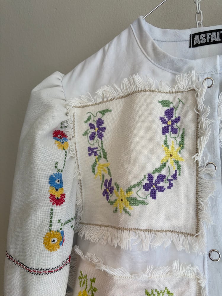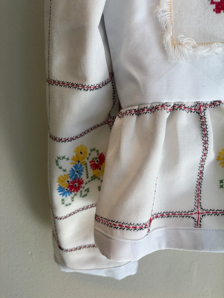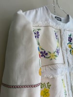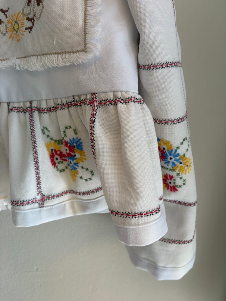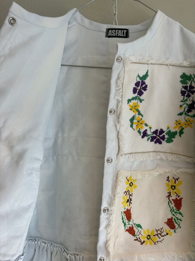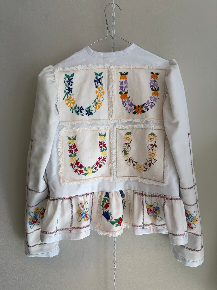I call it the lucky flower jacket because the flowers are shaped as horseshoe’s Sleeves and skirt is from a beautiful embroidered tablecloth.