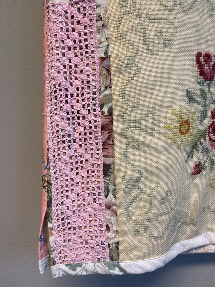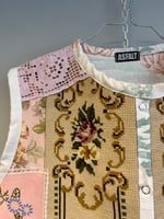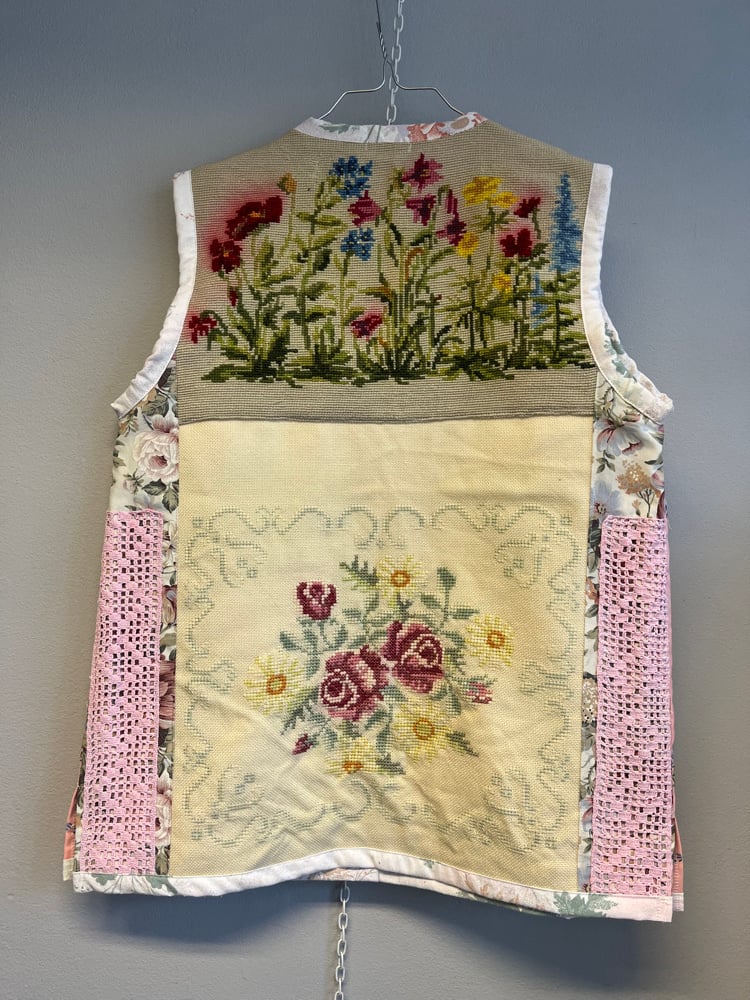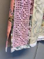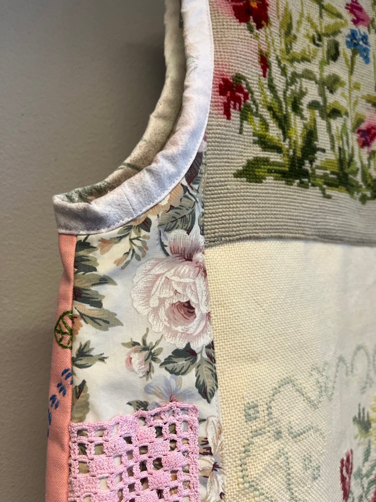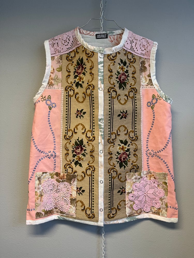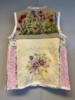 Pink power vest in needle point, embroidery and bobbin lace treasures.