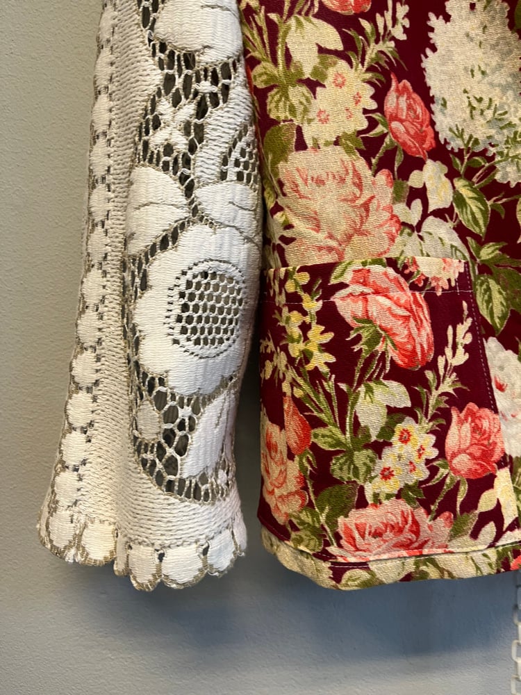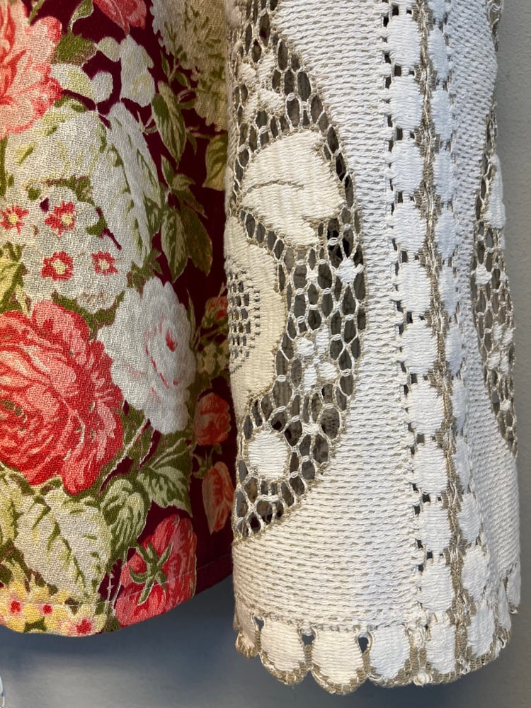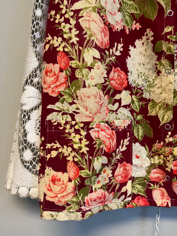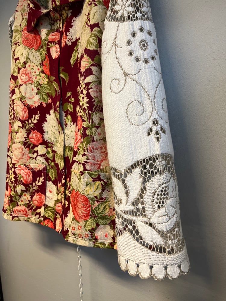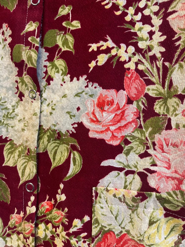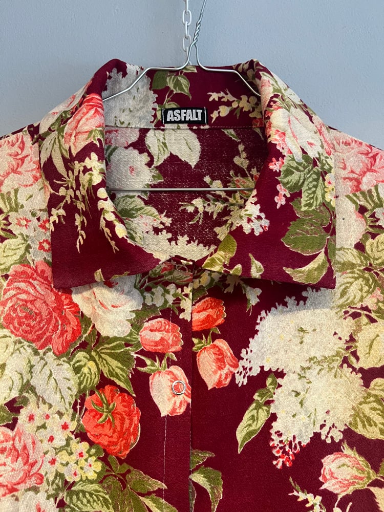 Skjorte syet af smukt gardin med rose print. Stoffet er en smule afbleget få steder, men stadig mega smukt.