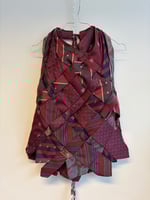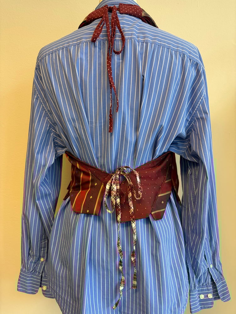 Bliver bundet i nakken og i taljen med bånd (skjortekanter).