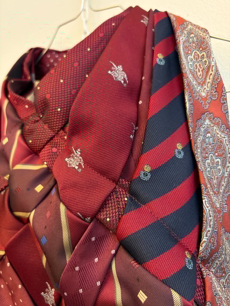 Slipsene er silke, polyester og satin. Jersey er bomuld.