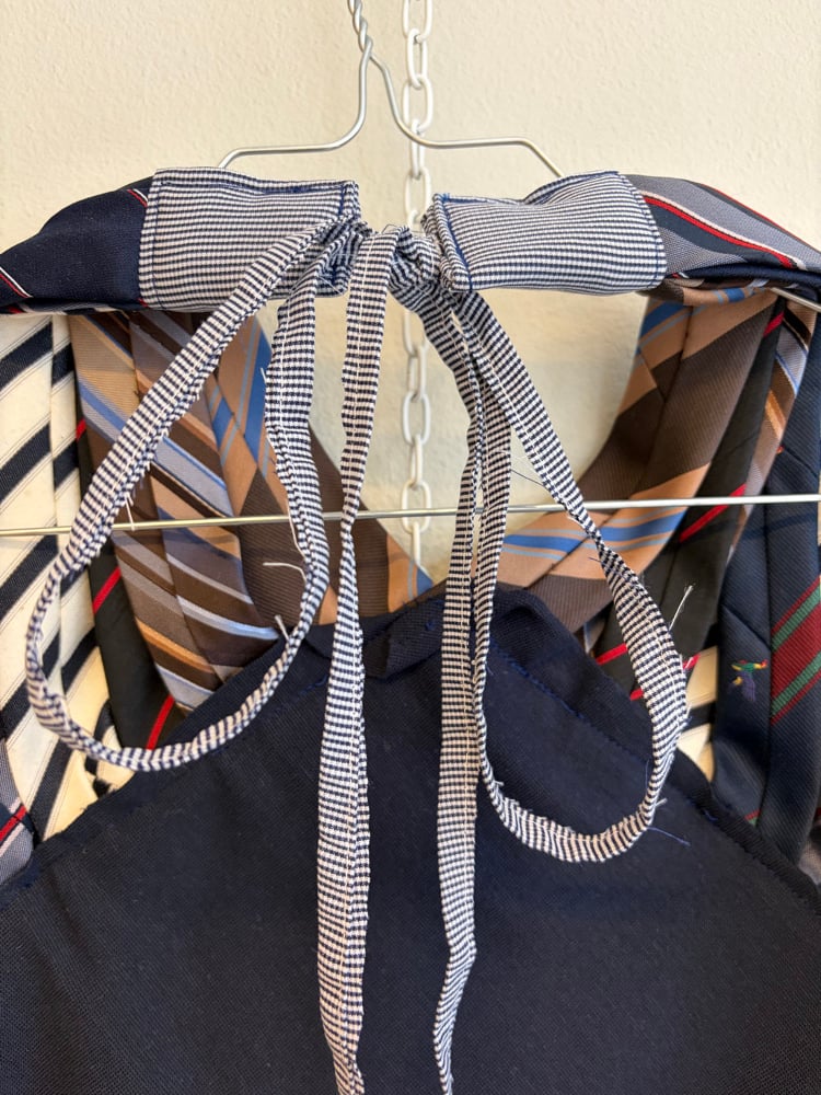Bliver bundet i nakken og i taljen med bånd (skjortekanter).